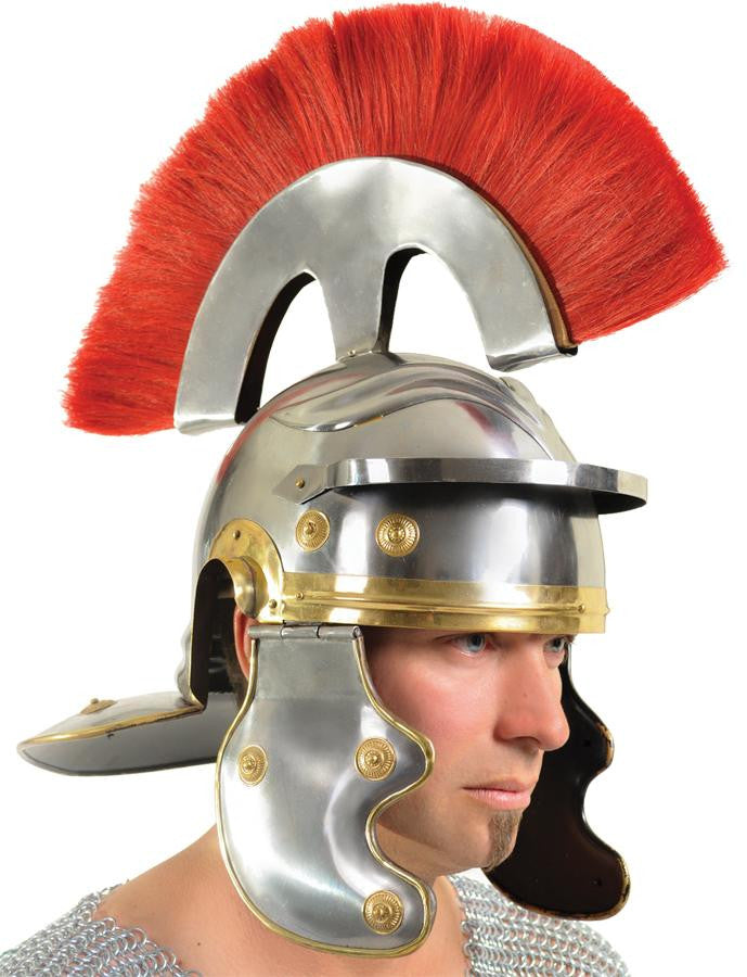 The Centurion was a professional soldier that commanded 100 men. The majority of the Roman Legions' command fell to the Centurions. This helmet is made of 18 gauge steel and features cheek guards and a simulated horse hair plume. It is fully wearable and fits most head sizes up to 7 5/8. Also makes a great display conversation piece. 2 lbs, 16 inches tall.