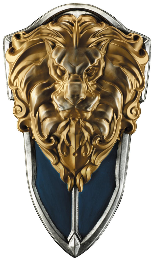 Shield modeled after weapon used in the new movie Warcraft based off of the Worlds of Warcraft game. Plastic. Shield measures 29 inches high and 16.25 inches wide.