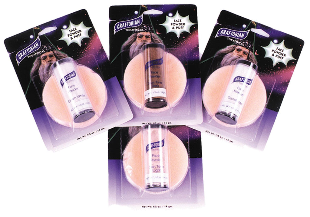 Use clown white powder to set stark white foundation and add brightness to the face. Translucent powder to set most colors without dulling. Skin tone light or dark powder is used for a more dramatic effect. 1/2oz.