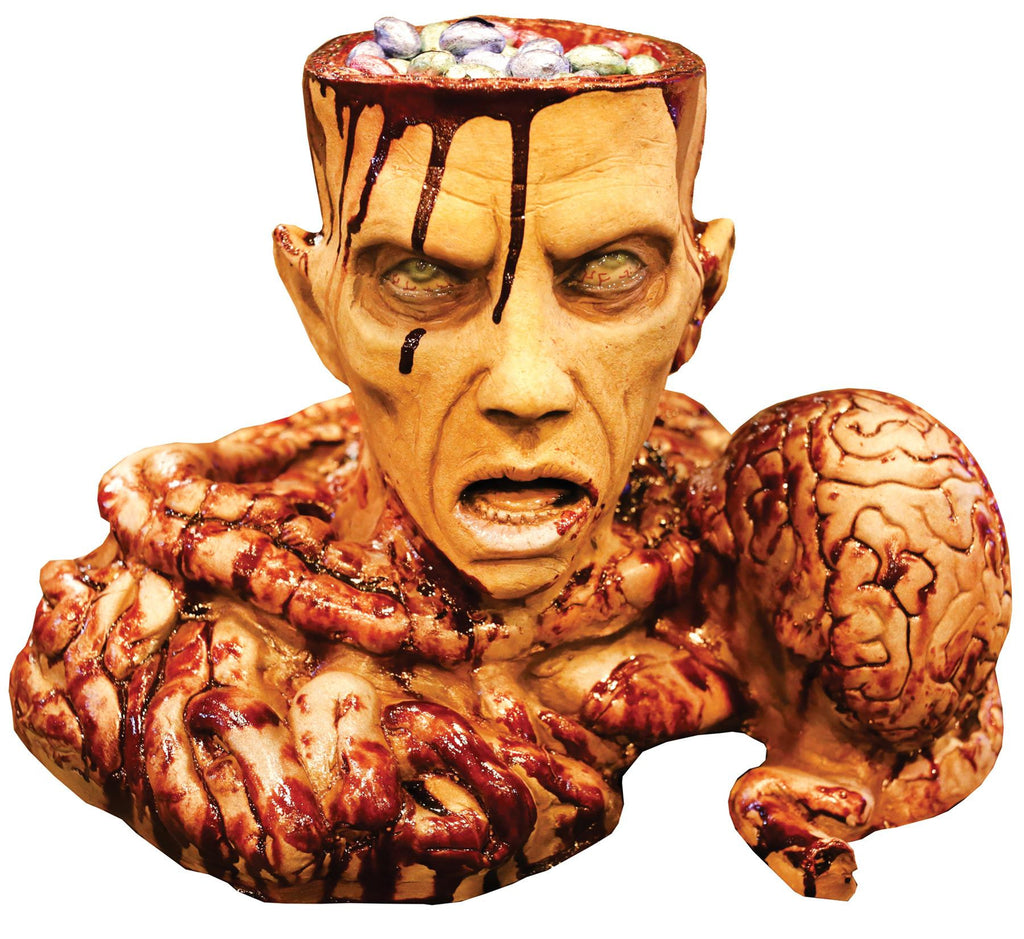 The perfect candy bowl for your Halloween Party! Top of the head has been removed so you can place candy on the inside with plenty of intestinal goo scattered around. Latex and foam.