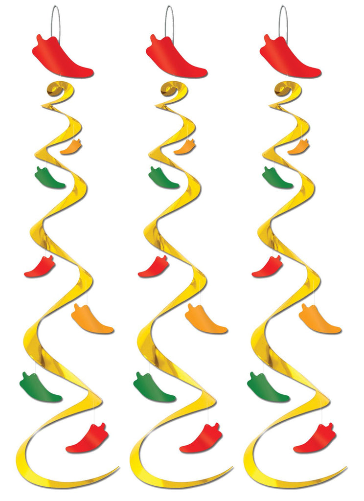 These festive and colorful chili pepper whirls will be the hit of your Cinco De Mayo party or any other event that needs a little spice. Gold whirls with large red chili pepper at top and little peppers dangling from the whirl itself. Metallic. 3 whirls per item. 30 in.