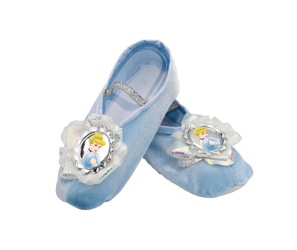 Light blue child cloth ballet slippers with character cameo. Fits child shoe size 10-12, ages 3 to 6.