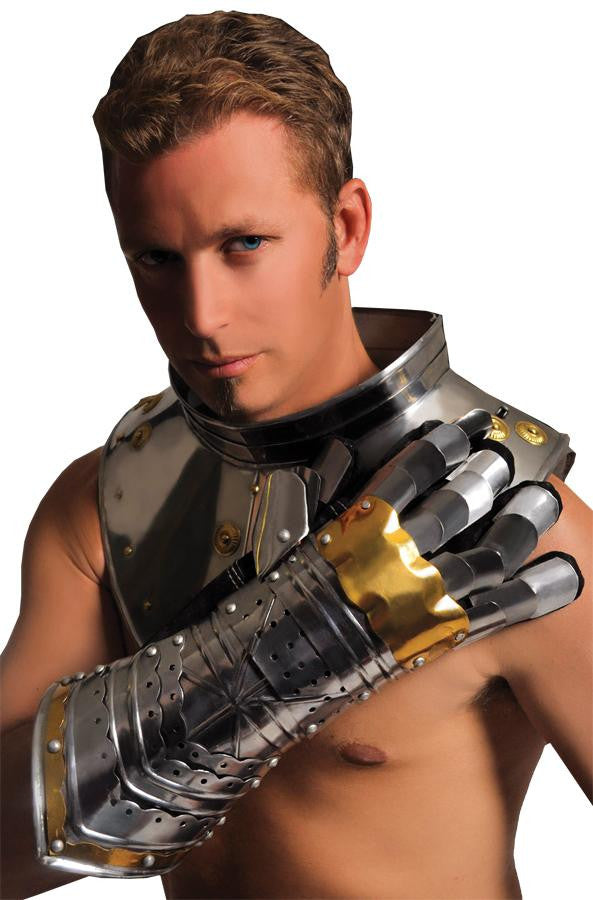 Historically, gauntlets were used by soldiers and knights. It was considered an important piece of armour, since the hands and arms were particularly vulnerable in hand-to-hand combat. Silver steel, it has a golden "knuckle duster" plate for protection. 17 1/2 inches long, 2.14 lbs for the pair together.