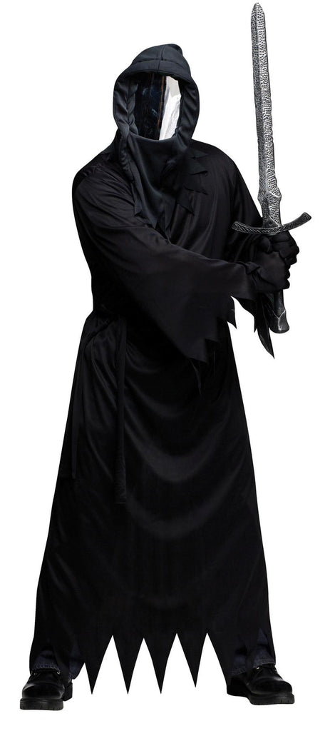 Black robe, hood with mirror-front mask, gloves, and tie belt. Adult standard fits up to 6' 200 lbs.