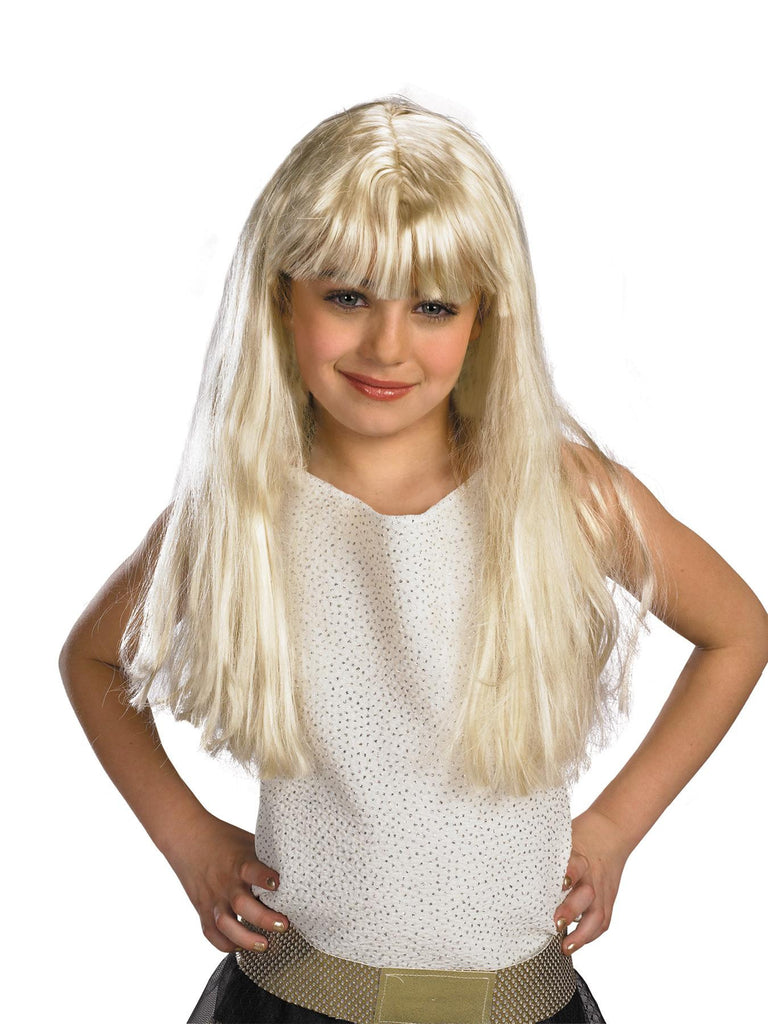 Hannah would never be seen without her wig! Long blond wig with blunt cut bangs. One size fits most.