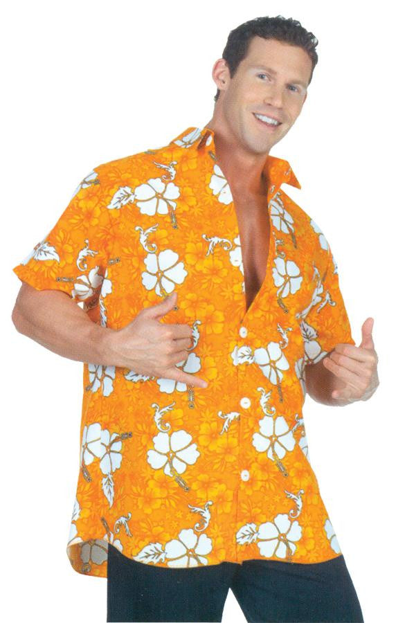 Great for luau's and other parties! Orange floral-print Hawaiian-style shirt with short sleeves. Adult one size fits sizes 42-46. Woven polyester.