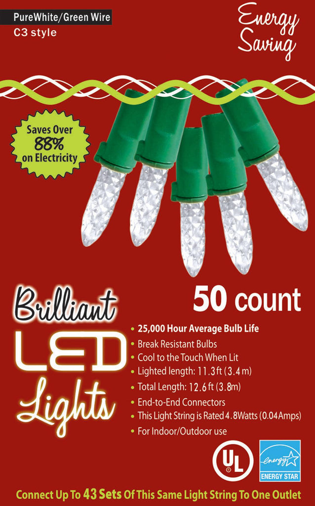 String light set perfect for Christmas or party decoration! 50-count Brilliant LED lighting. Pure white lights with green cord that has end to end connectors. String has a 11.3 ft lighted length/12.6 total length. Rated: 4.8 watts (0.04amps)/set, 3.0A/120V Fuse, Spare 1 bulb/1 fuse. Colors of lights are Red, Blue, Yellow, Green, and Orange. Can connect up to 43 sets of same light string to one outlet!