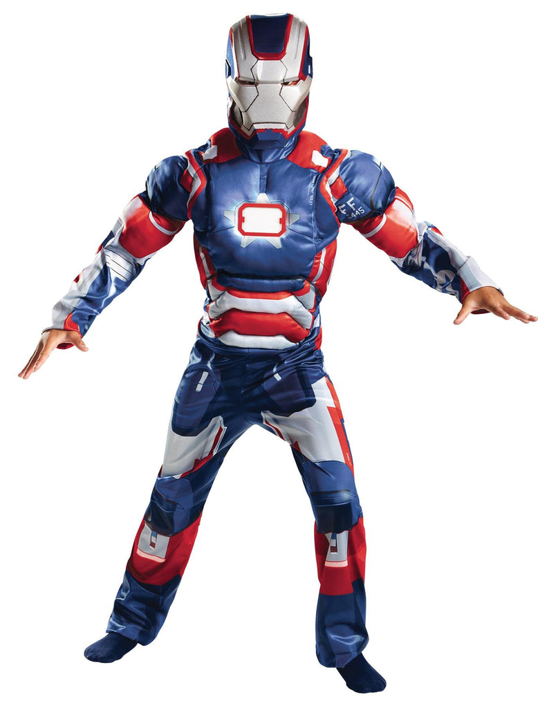 Jumpsuit with muscle torso and arms, LED arc reactor, three (3) LR44 (AG13) batteries and character mask. Fits child sizes 10-12.
