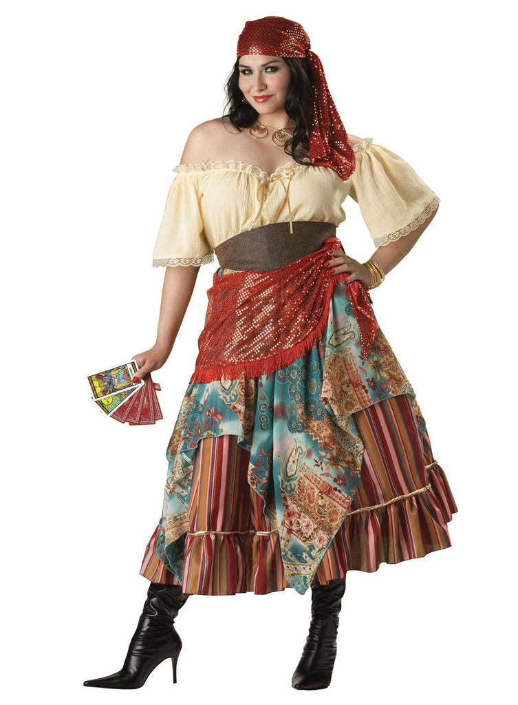 Dress with attached scarf skirt, ruffled underskirt with attached tulle petticoat, sequined waist sash and bandana, embossed vinyl belt, plus six fortune teller cards. Jewelry not included. XXL fits 20-22.