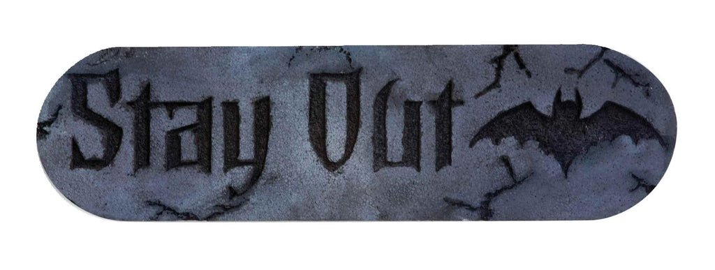 Realistic stone-look with words Stay Out and Bat design. Made of foam construction Approximately 12 wide x 4" tall and 1" thick