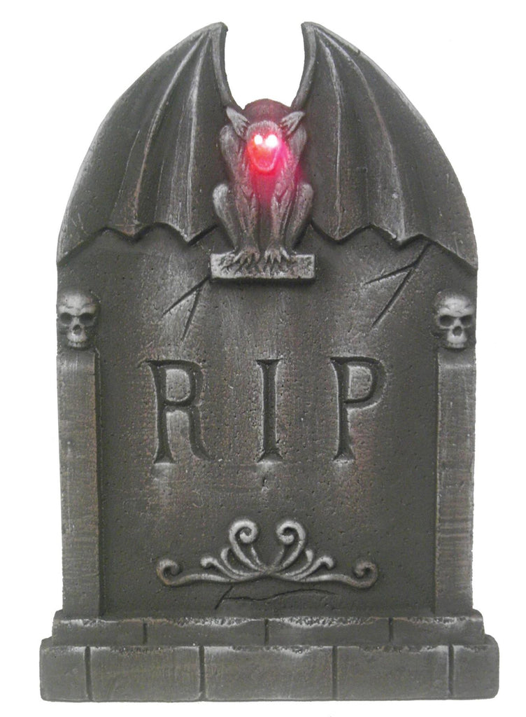 24 inch tall tombstone has a gargoyle with light-up eyes! Realistic stone-look tombstone is a great decoration for your next party, home haunt,or haunted house! Included are 3 LR44 button batteries which are also replaceable. These are made of polyfoam.
