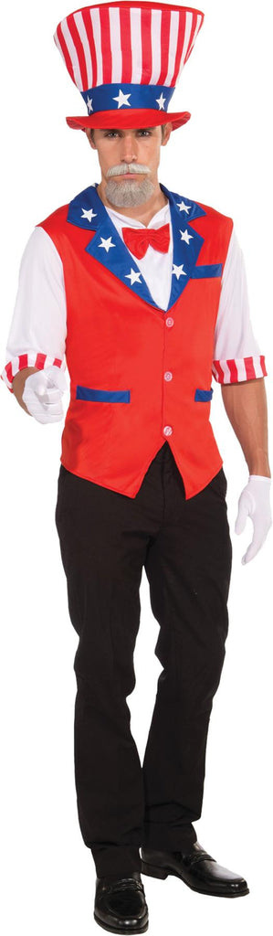 Celebrate tax time or the 4th of July in style! Great foam hat with patriotic theme and lightweight shirt designed to look like vest with lapels and bowtie. Short-sleeves. One size fits most.