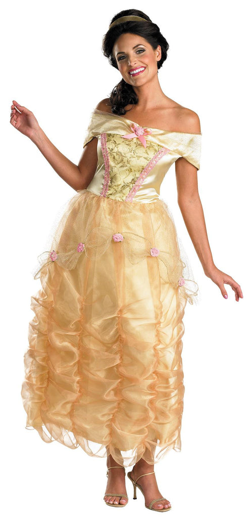 Be the princess of your dreams! Deluxe gold dress with gathered skirt overlay, pink rosettes, and matching headband. Shoes not included. Fits adult sizes 8-10. Deluxe costume.