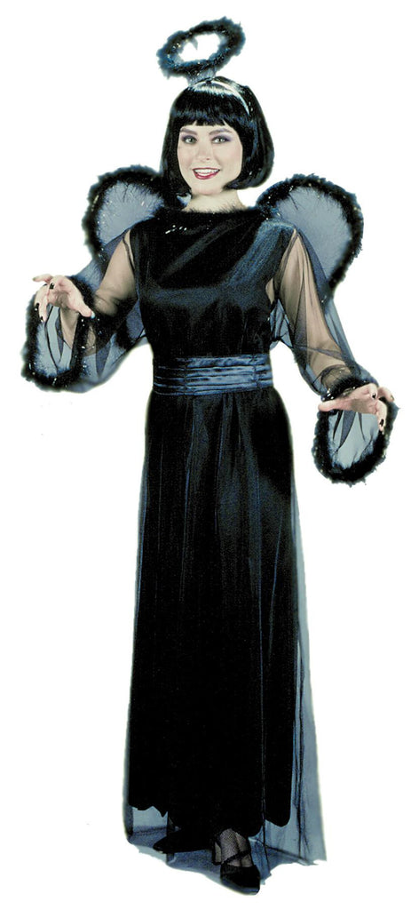 Nylon sleeveless dress with sheer black long sleeve overlay with maribou accented cuffs, sheer wings with maribou trim, belt, and maribou halo. All black. One size fits sizes 4-14.
