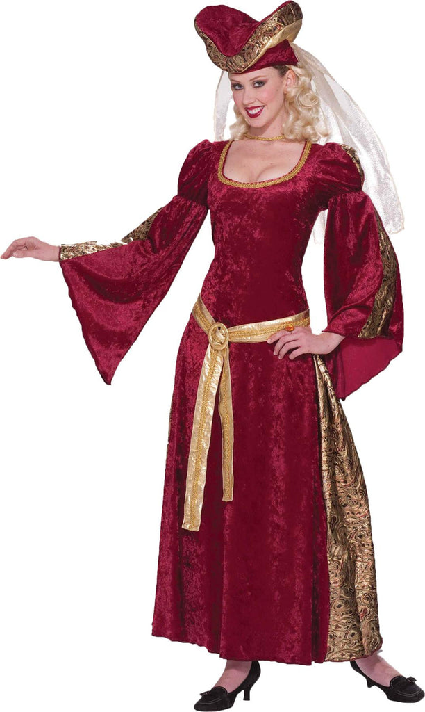 Perfect for any royalty! Deep red velvety dress with metallic gold and red brocade insets on the skirt and sleeves, has self-ties in back for custom fit, and comes with a matching headpiece with sheer sparkly veil and a golden belt. One size fits most women sizes 6-14.