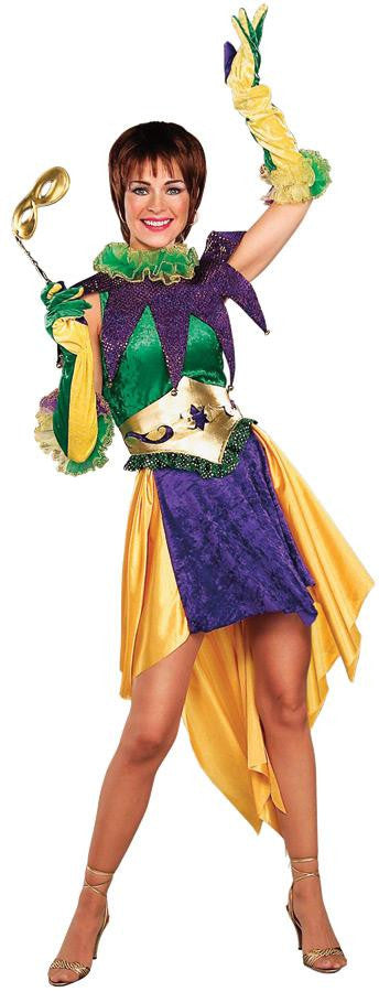 Strikingly colorful and sexy costume perfect for the Mardi Gras or anytime you want to make a colorful statement. Includes dress, collar, gloves, and belt. Add your own mask. Standard size fits up to size 12.