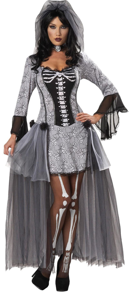 White dress with black lace overlay-look has sheer black sleeve trim and sheer gray overskirt train. Skirt is short in the front to show off the sheer skeleton bone hosiery. Includes sheer gray veil, black lace trimmed choker, and skeleton bone hosiery are included. You will be dying to wear this costume! Haha! Adult small fits sizes 4-6.