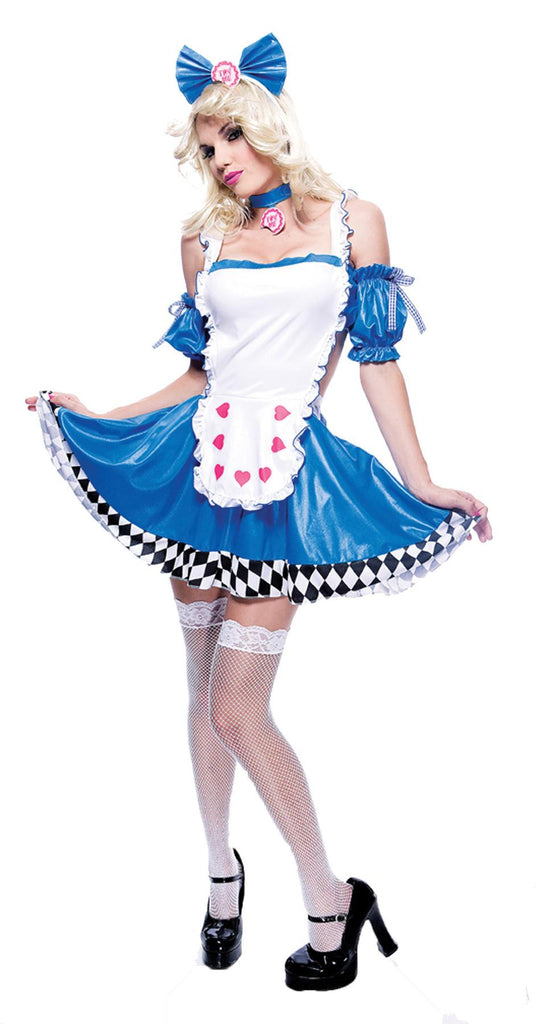 Blue dress with crinoline mesh inside, attached black and white checkerboard petticoat, white apron and white shoulder straps. Pink and red hearts on apron. Blue arm puffs with bows, matching headband and necklace. Dress has open back. Fits size 4-6. Shoes and tights not included.