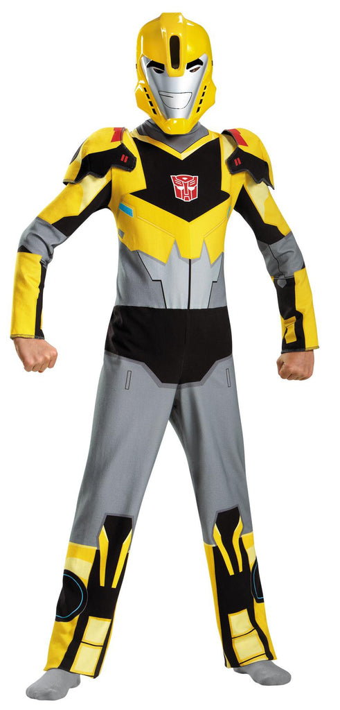 The popularity of Transformers has spanned generations and now fathers who loved them are able to watch the new movies and TV shows with their kids. This new costume is based on the current cartoon and should continue the enjoyment as it becomes the most popular Halloween costume this year! Bumblebee's costume is a yellow,gray, and black jumpsuit and includes a plastic character mask with strap for secure fit. Fits child boy's sizes 4-6. 100% Polyester. Care instructions: Do not dry clean. Hand wash cold separately. Do not bleach. Line dry, cool iron if necessary.