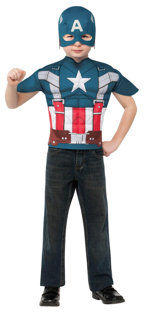For little superheroes who need a quick and easy costume. Muscle chest costume top and mask. Fits child small sizes 4-6.