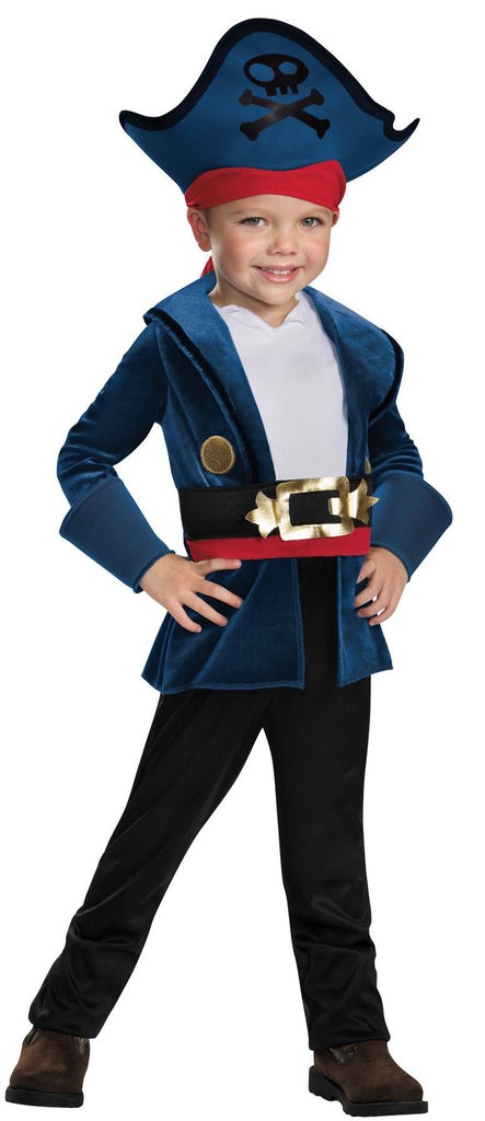 From the Disney show Captain Jake and the Neverland Pirates! Captain Jake Classic includes a jumpsuit with attached jacket, attached belt, and character hat with bandanna. Child small fits sizes 4-6.