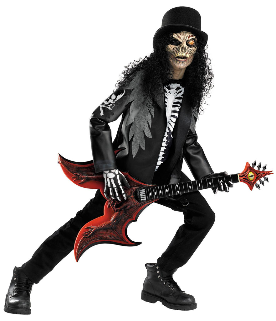 You can rock out with this great gothic rock costume! Jacket with faux printed shirt, half-cap jawless mask with attached hat and hair. Supply your own pants, guitar, and makeup for hands and face. face. Child size 7-8.