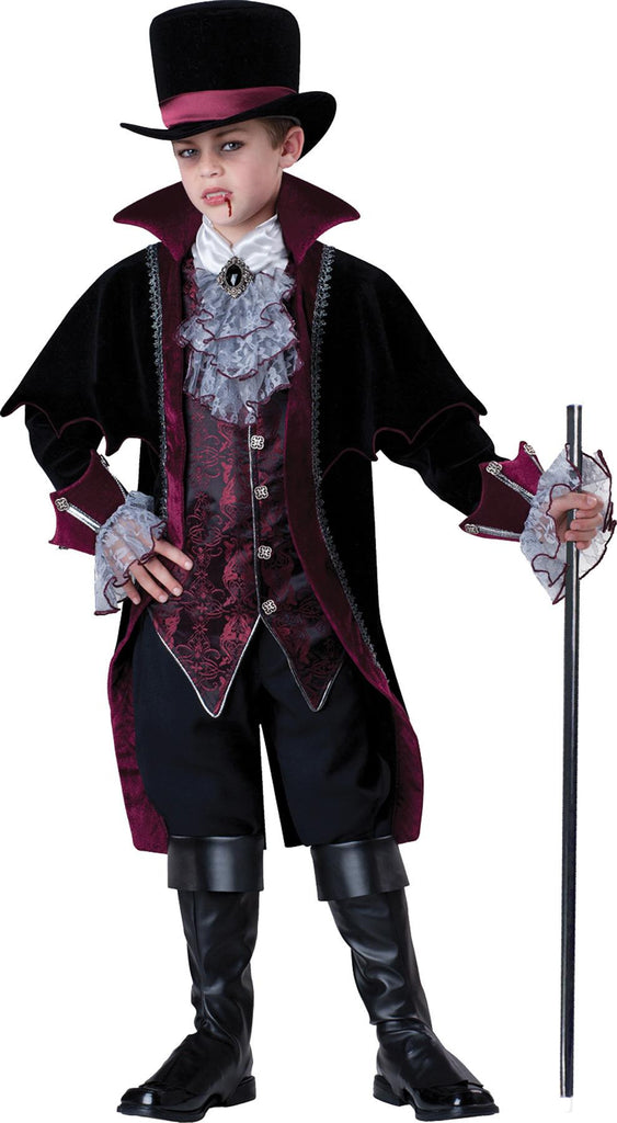 Long velvet coat with attached capelet and lace sleeves, brocade vest with attached dickie, pants, hat and boot covers. Cane and fangs not included.