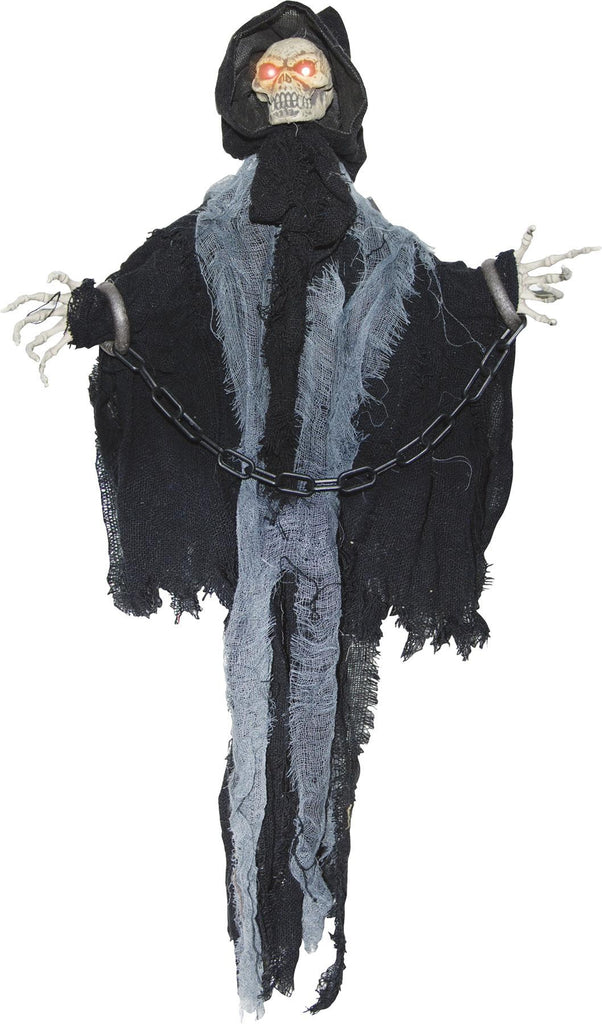 A great addition to your home haunt or haunted house, this slashing black reaper in chains is sure to make your victims tremble in fear! Arms move, eyes light up, and has sound. Uses 2 AA batteries which are not included. Sound activated. 23.6 x 17.7 x 2.8 inches.