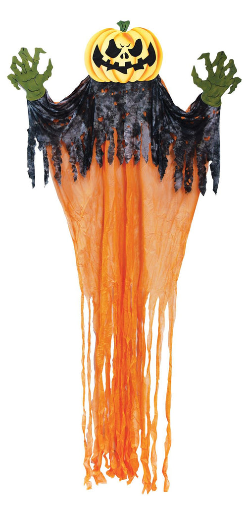 This is a fearsome prop that will definitely get your victims attention. Pumpkin head with green hands, and black and orange tattered draping. Item measures 11 feet tall. Pumpking head measures 20 inches x 14 inches x 1 inch. Pumpkin head and hands are soft lightweight polyfoam material.