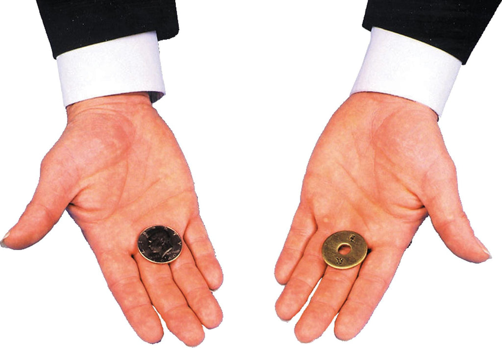 You show two coins. A chinese coin with a hole in the center, and a US half dollar which vanishes, and in it's place are two Chinese coins with a hole in the center.