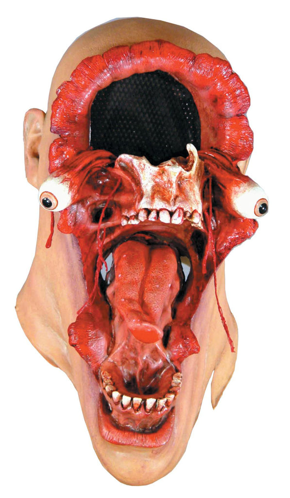 Imagine a human head taken completely apart. Well, this is it. A full over-the-head latex mask that is blown completely apart. Screen front conceals your face. You won't believe your eyes.