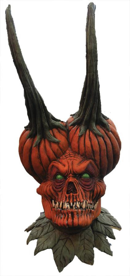 When you see this living pumpkin-on-steroids approaching you head for the nearest door! Full over-the-head latex mask featuring twisted pumpkin-skull motif with two horns protruding from the tops of conjoined pumpkin bulges. One size fits most.
